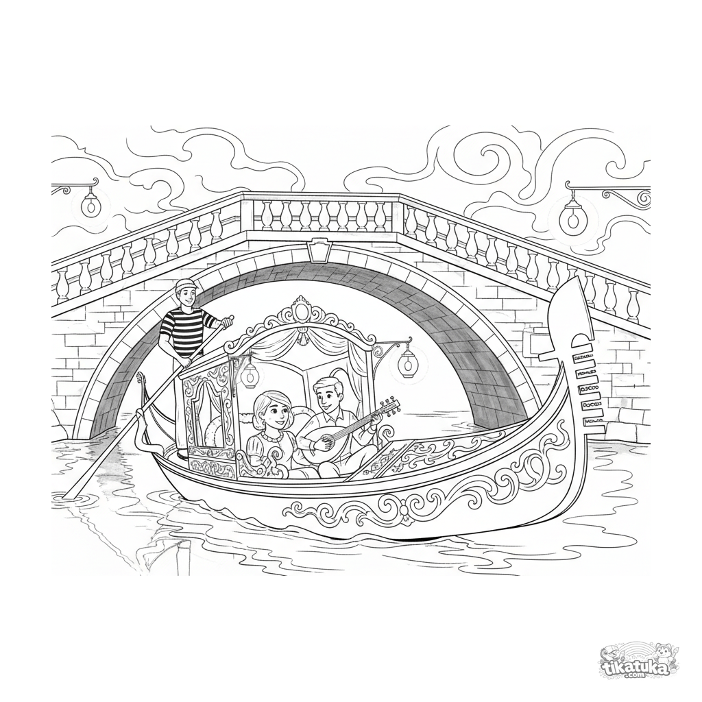 Detailed coloring page for older kids 10-12: an ornate Venetian gondola with a musician glides under a bridge at dusk. Intricate scene with architecture and lantern light.