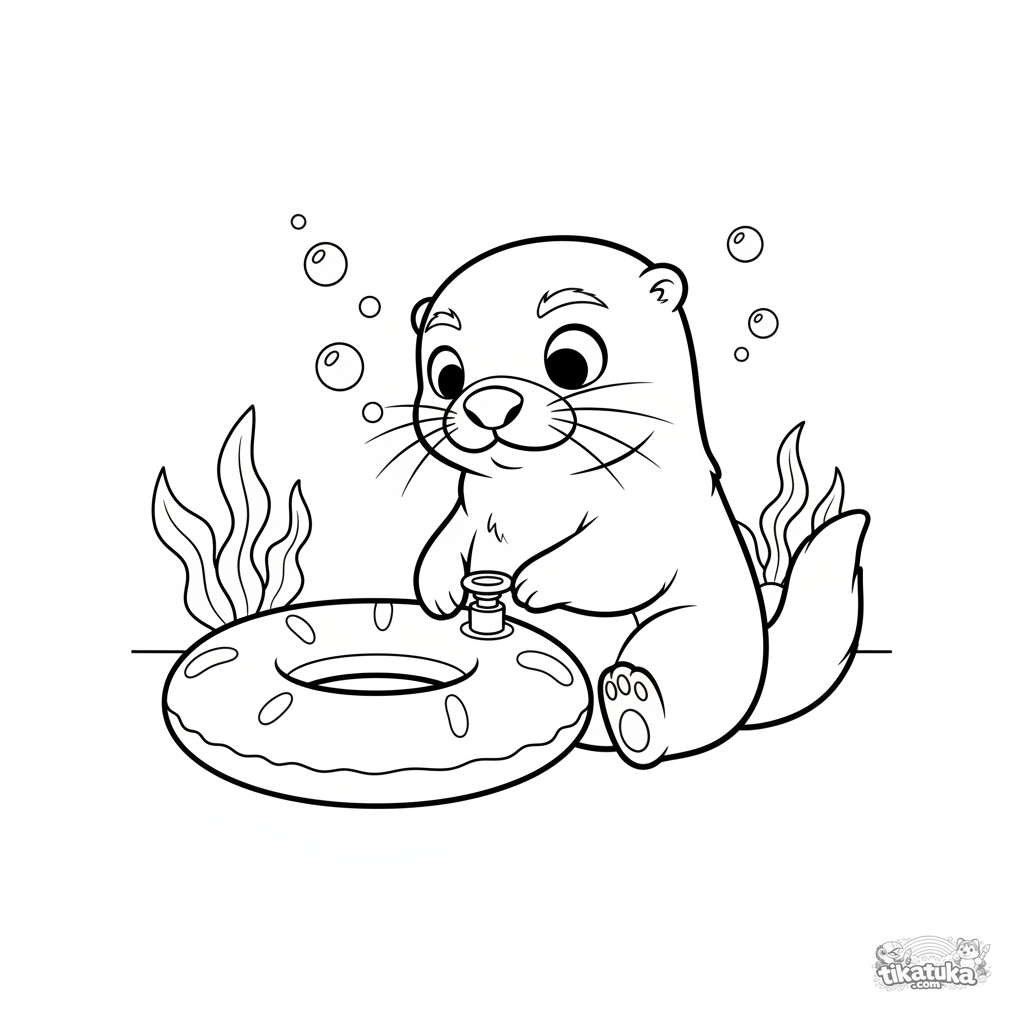 Coloring page for kids 4-6: a mischievous otter pup sits on the pool floor, curiously investigating the valve of an inflatable ring. Fun scene.