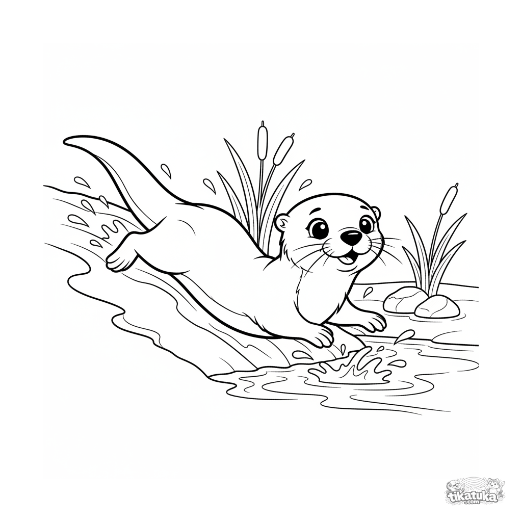 Coloring page for tweens 7-9: a joyful otter slides down a muddy bank into a clear stream. Dynamic pose, expressive emotions, comic-adventure style.