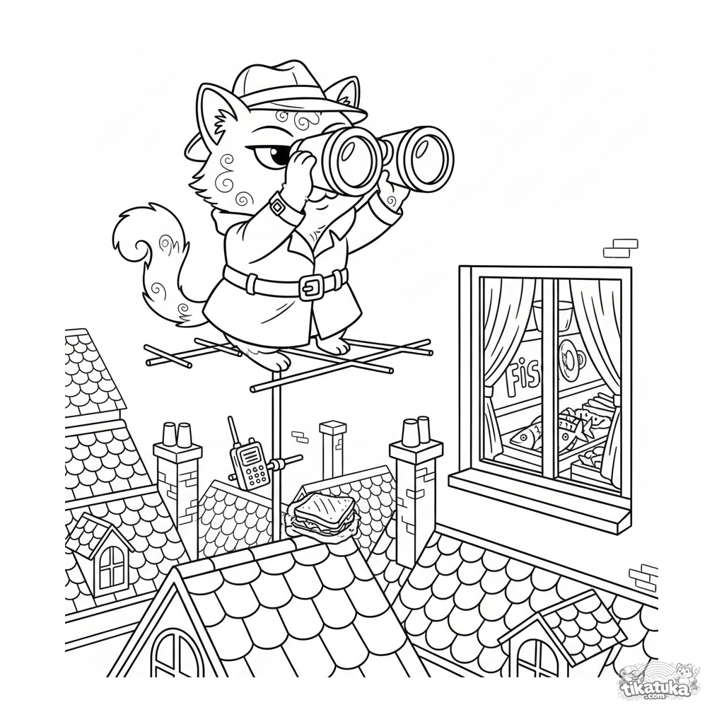 Coloring page for kids 10-12: an overconfident cat spy in a trench coat uses binoculars on a rooftop antenna to scout a fish shop. Humorous detailed scene.