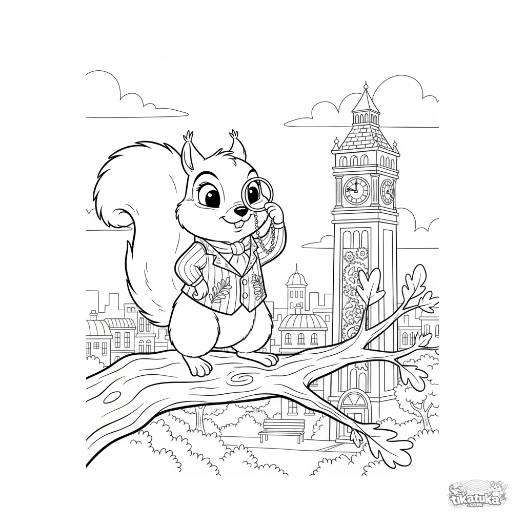 Meme-style coloring page: a dapper squirrel in a waistcoat and monocle in a tree studies a bank tower. Detailed and funny scene for kids 10-12.