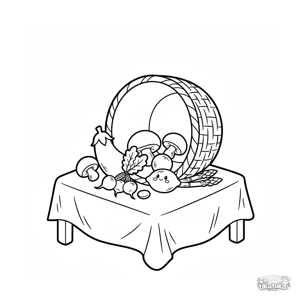 Simple coloring page for toddlers 2-3: a full basket of vegetables and fruits at the market. Large recognizable shapes, thick outlines, folk print style.