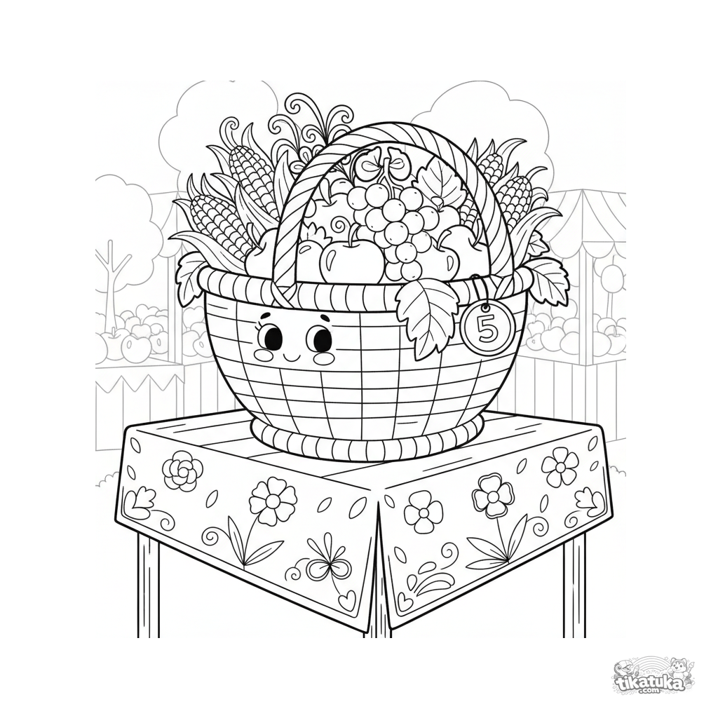 Coloring page of a cornucopia basket overflowing with harvest on a market stall. For kids 4-6. Bright folk lubok style.