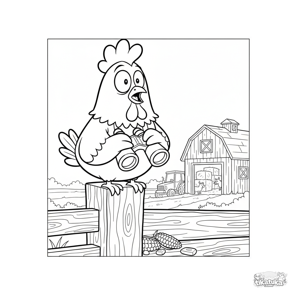 Coloring page for kids 10-12: a panicked chicken on a fence post looks through binoculars at something in the barn. Funny meme with overreaction and details.