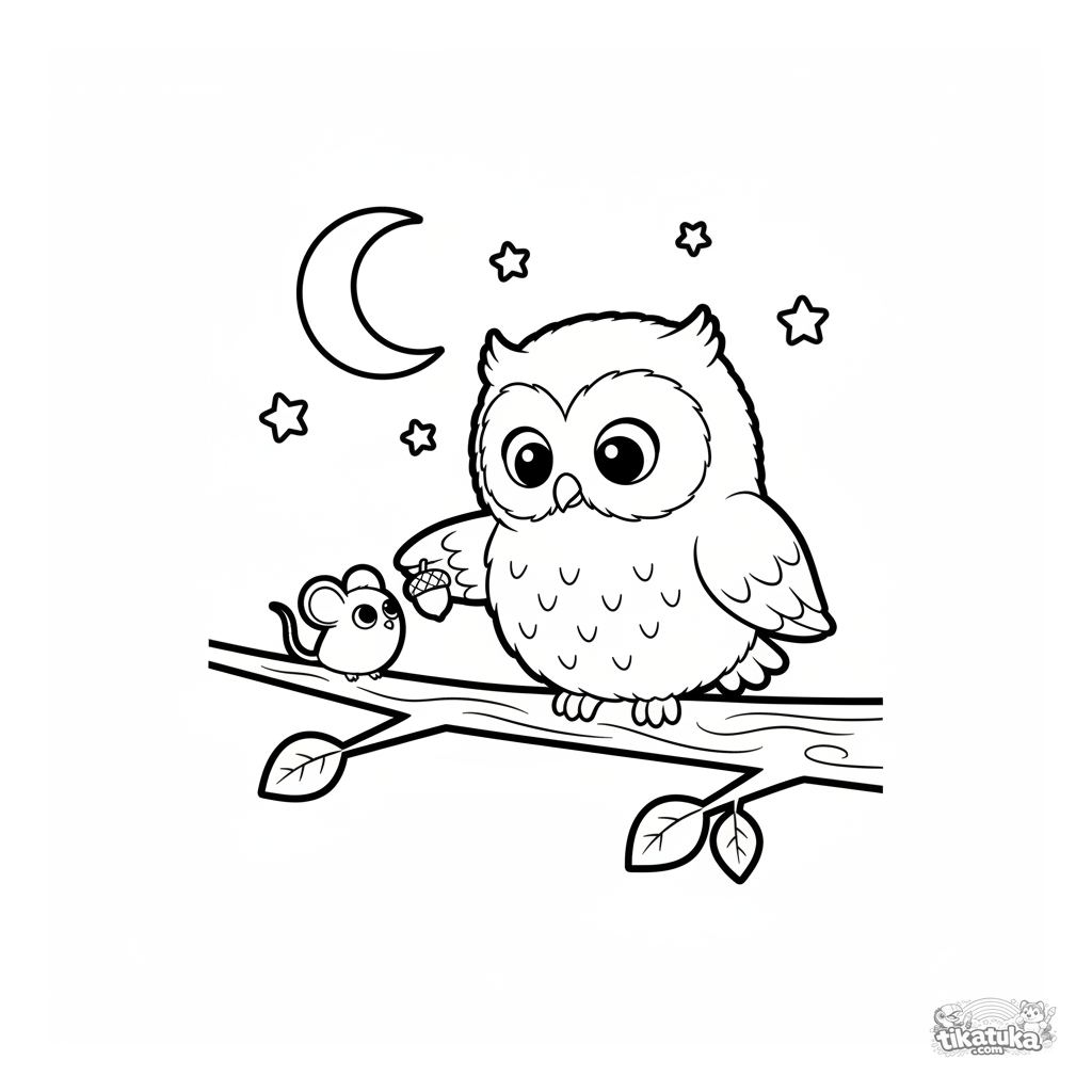 Simple toddler coloring page: a kind owl helps a little mouse on a forest branch. Large friendly characters, very simple lines, wide margins.