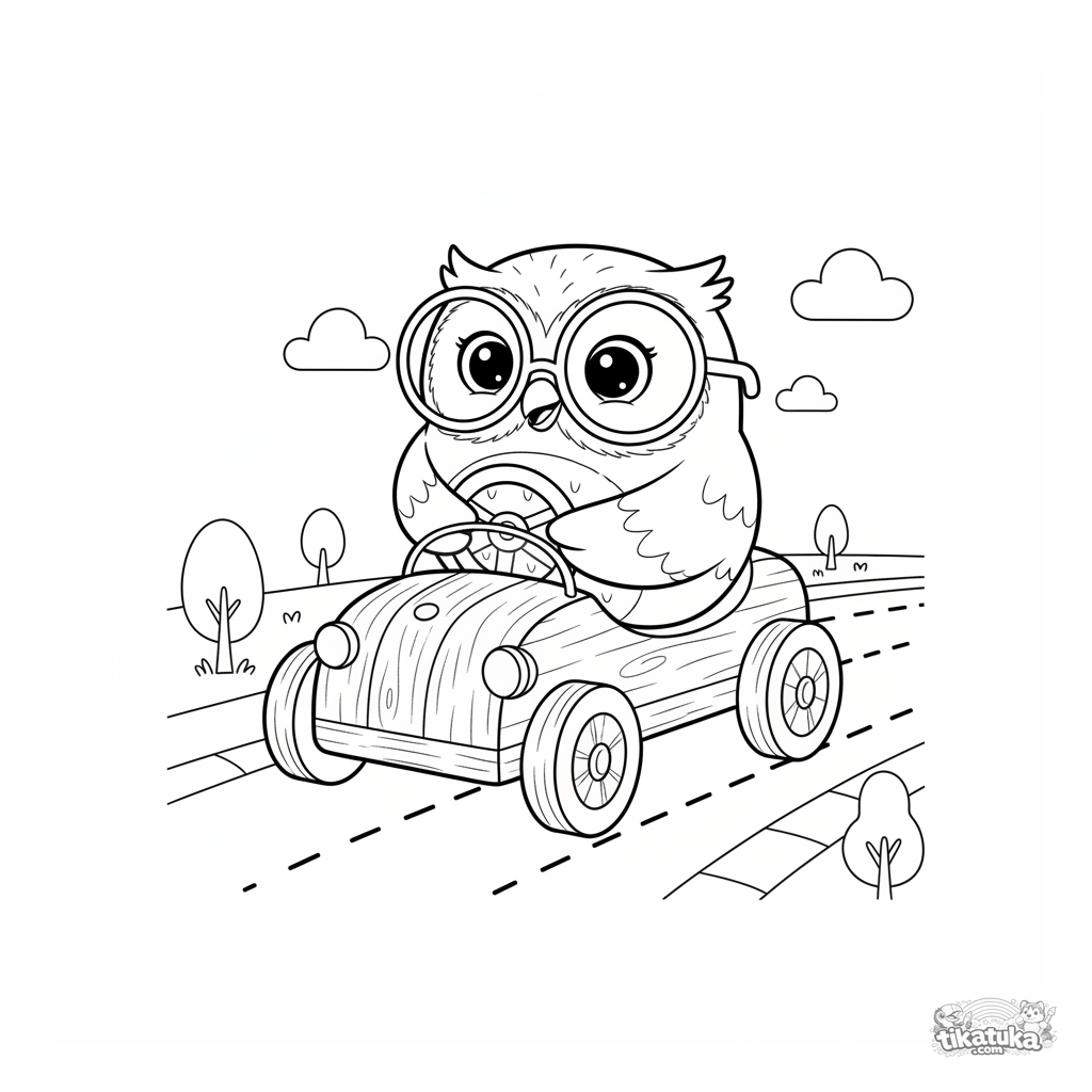 Coloring page for boys 4-6: Owl Oof driving a wooden toy car on a race track. Geometric shapes, Scandinavian wooden toy style.