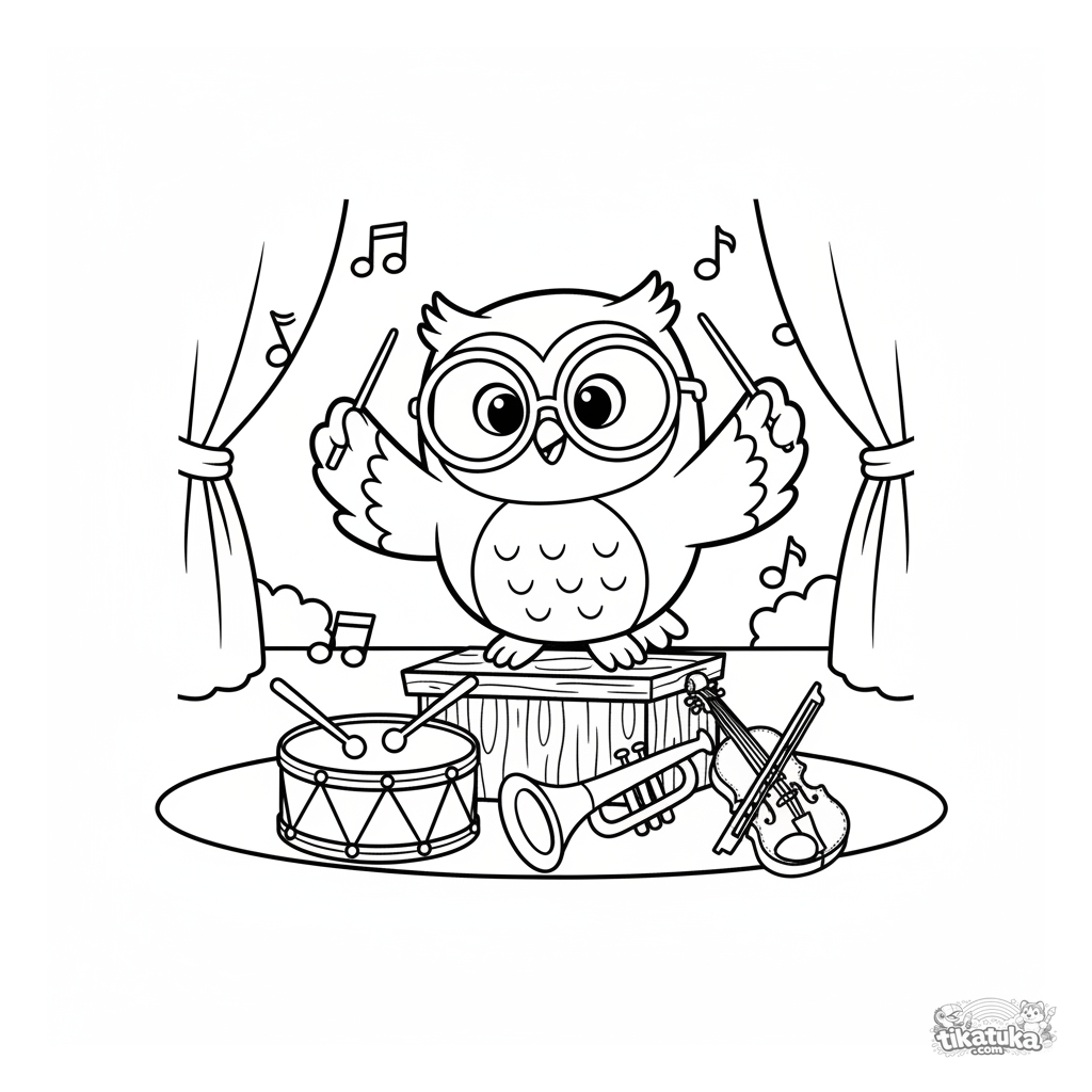 Coloring page for kids 4-6: Owl Oof conducts a cheerful orchestra of toy instruments. Soft puppet style, floating musical notes.