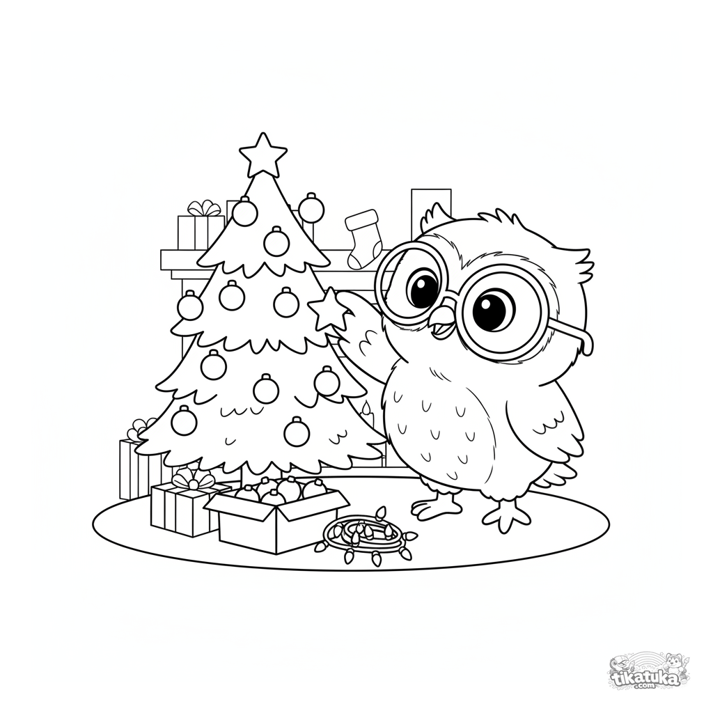 Coloring page for kids 4-6: plush owl Oof decorates a Christmas tree with a star and ornaments. Cozy holiday scene, clean outlines, simple shapes, Scandinavian toy style.