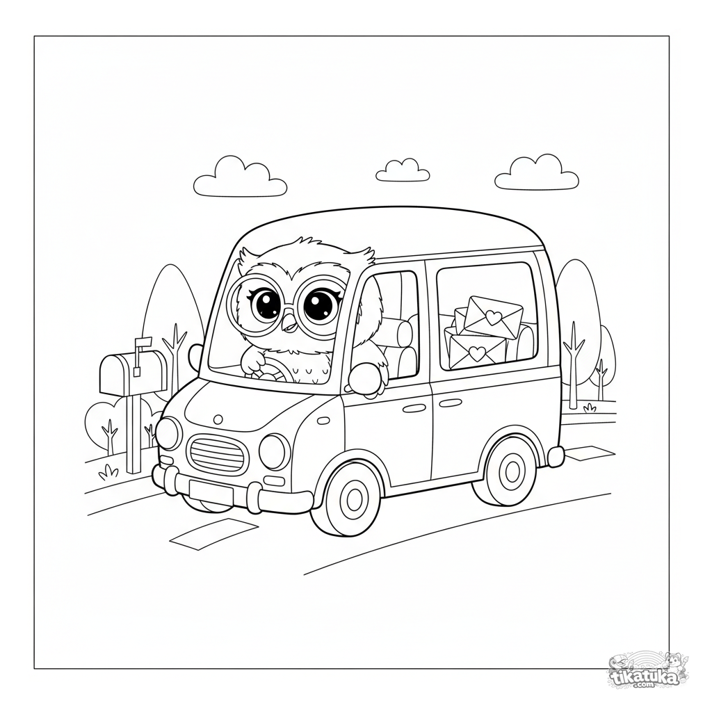 Coloring page for boys 4-6: owl Oof driving a tiny postal van, delivering letters. Scandinavian plush style, simple shapes of the vehicle and road.