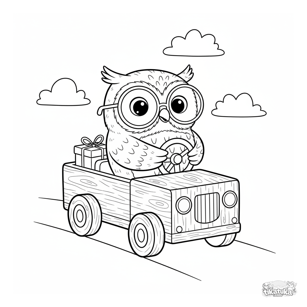 Coloring page for boys 4-6: owl Oof drives a wooden toy delivery truck. Clear outlines, Scandinavian toy style.