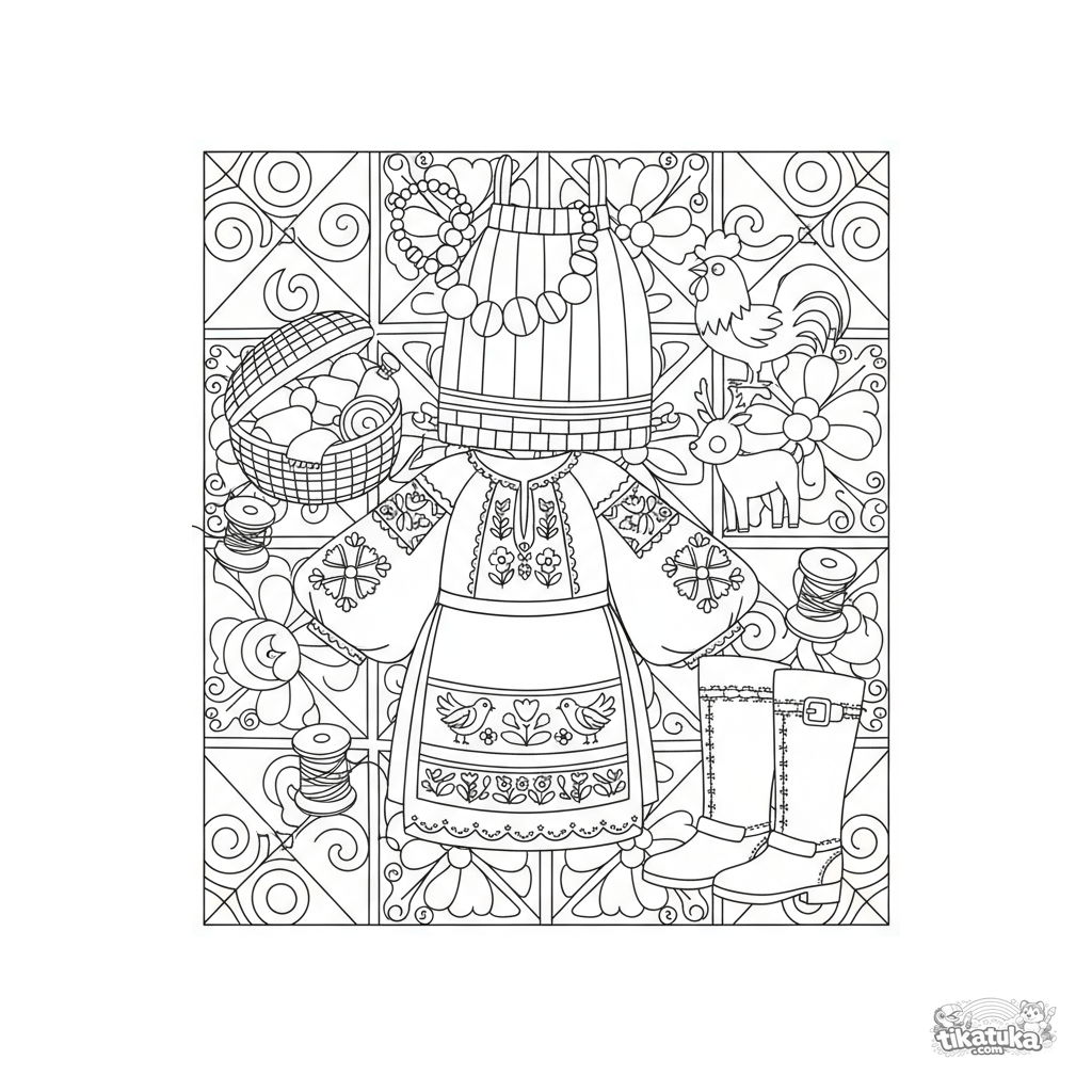 Intricate coloring page for girls 10-12: an embroidered folk costume flat lay on a quilt in a paper-cut style. Details include apron, beads, boots, and sewing basket.