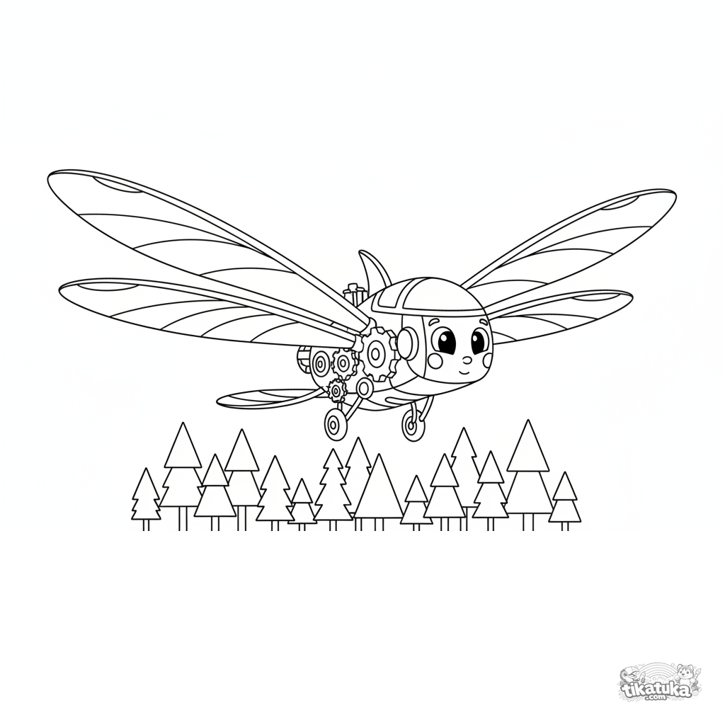 Coloring page of a fantastical ornithopter in a paper-cut style. For kids 4-6 years old. Crisp geometric shapes, interesting mechanical design.