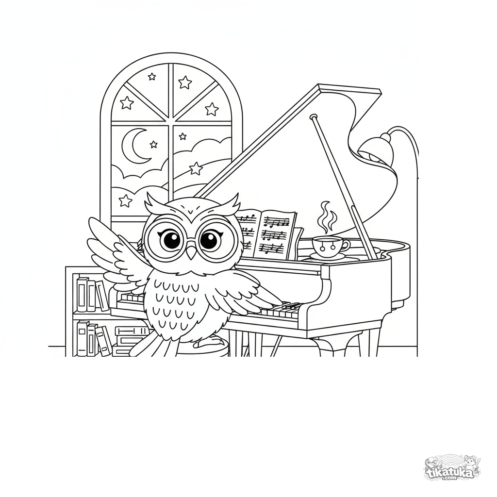 Coloring page for kids: a wise owl with spectacles plays a grand piano with its wings in a cozy, moonlit music room.