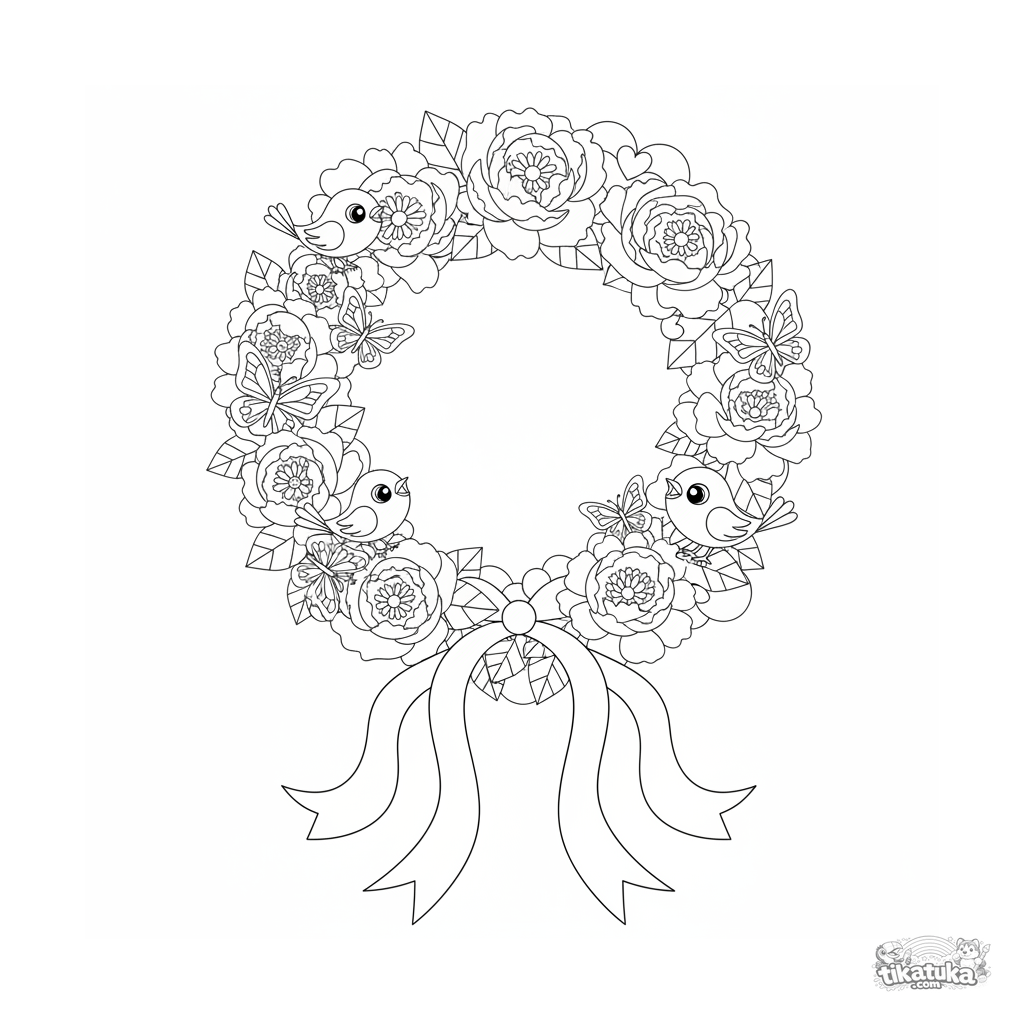 Coloring page for kids 7-9: a decorative peony wreath in a paper-cut style with ribbons. Crisp geometric outlines, symmetrical design.