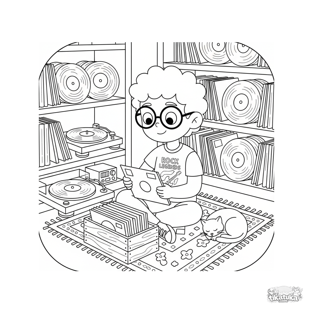 Paper-cut style coloring page for kids 7-12: a retro record collector examining an album sleeve in a cozy nook of a music club. A warm, detailed scene with a cat.