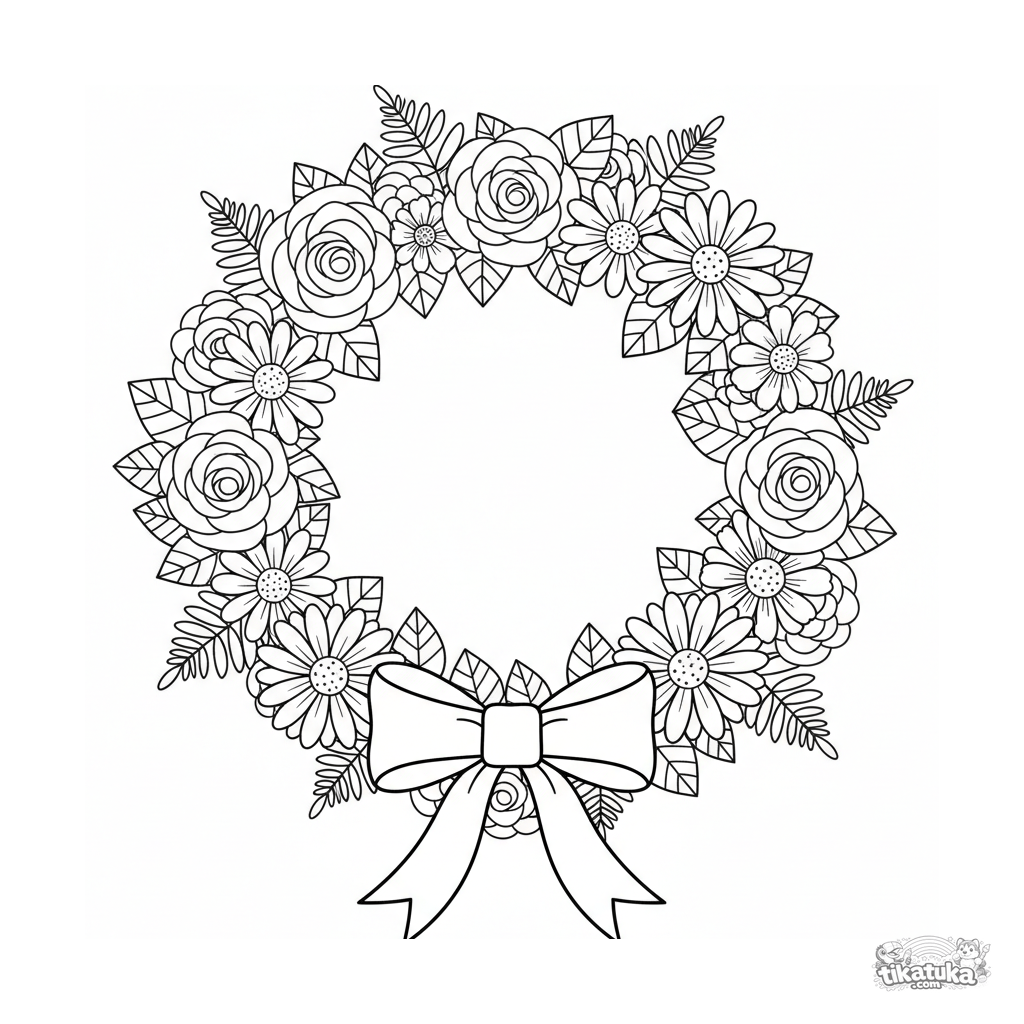 Tween coloring page: a decorative flower wreath in a paper-cut style with a ribbon. Symmetrical design, crisp outlines, moderate detail.