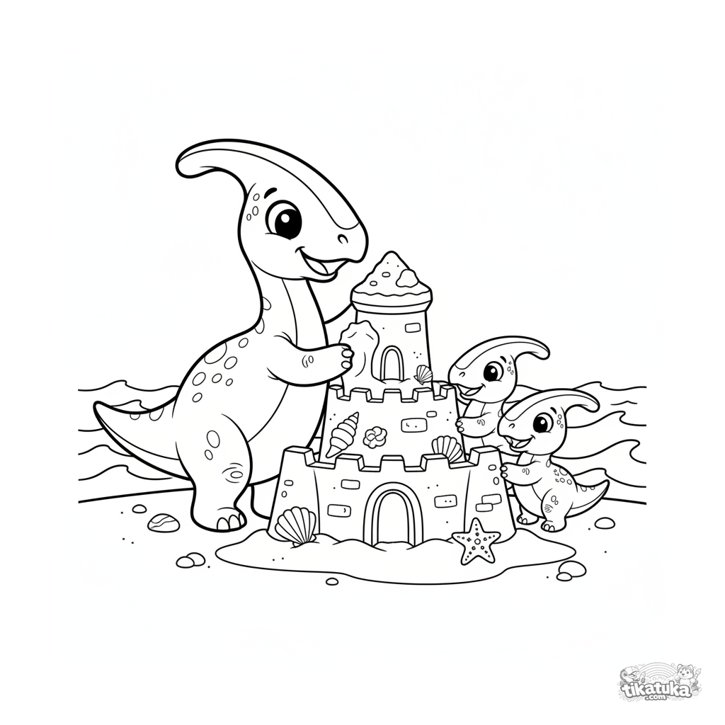 Coloring page for kids 4-6: a family of parasaurolophus dinosaurs building a sandcastle on an ancient ocean beach. A cute dinosaur scene for creative coloring.