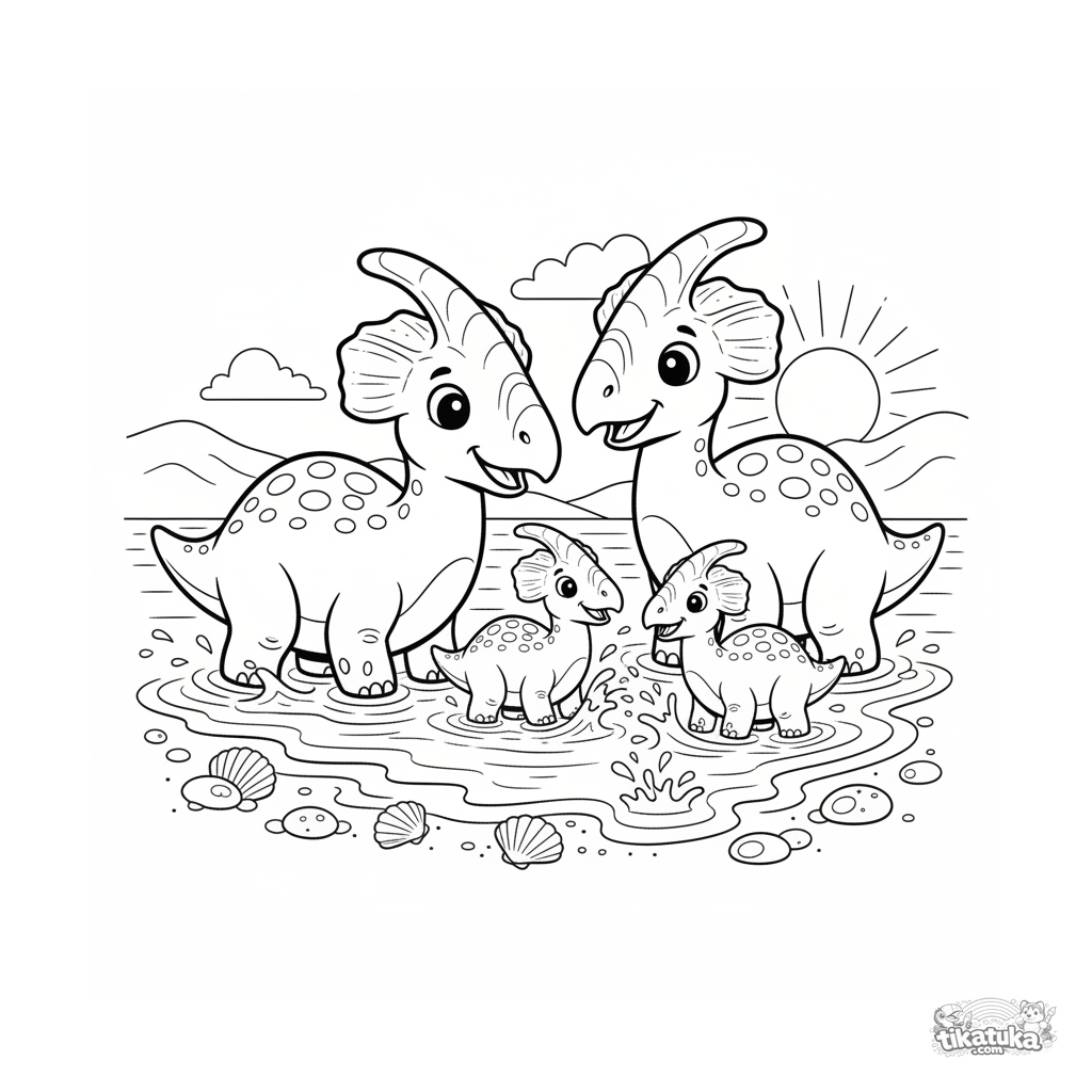 Coloring page for kids 4-6: a family of parasaurolophus dinosaurs on the sandy beach of an ancient ocean. A cute family scene to color.