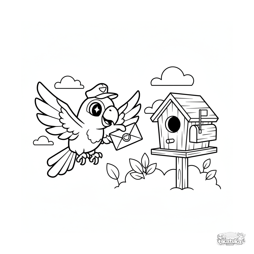 Coloring page for kids 4-6: a cheerful parrot wearing a mail carrier's cap flies with a letter towards a wooden birdhouse. 80s cartoon style, dynamic pose, simple shapes.