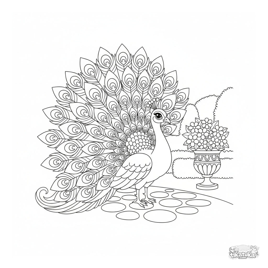 Coloring page for older kids: a majestic peacock fans its patterned tail in a beautiful garden. A detailed scene with a stone path and hedges.