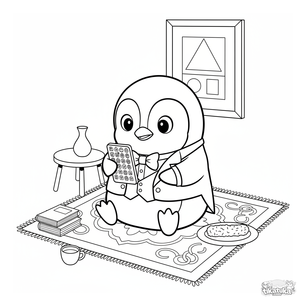 Coloring page for older kids: a penguin in a living room stares in confusion at a complicated phone app. A funny and relatable scene in cute chibi style.