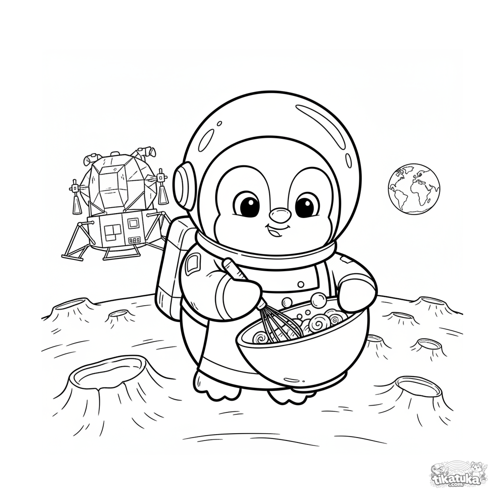 Coloring page for kids 4-6: penguin astronaut Marcel cooks food in zero gravity on the surface of the Moon. Geometric design in a wooden toy style.