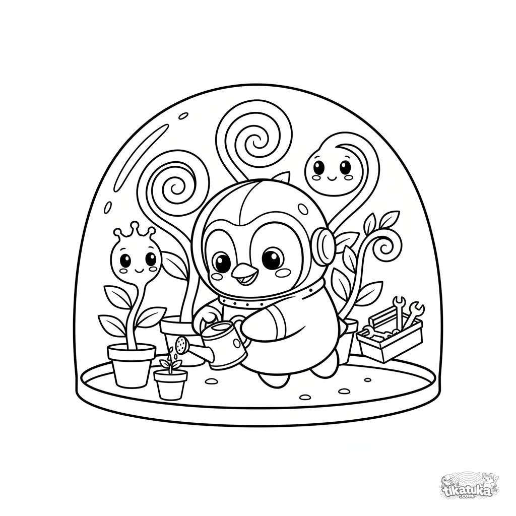 Coloring page for kids 4-8: chef penguin Marcel in a spacesuit tends to alien plants in a space greenhouse. A cute scene for creative coloring.