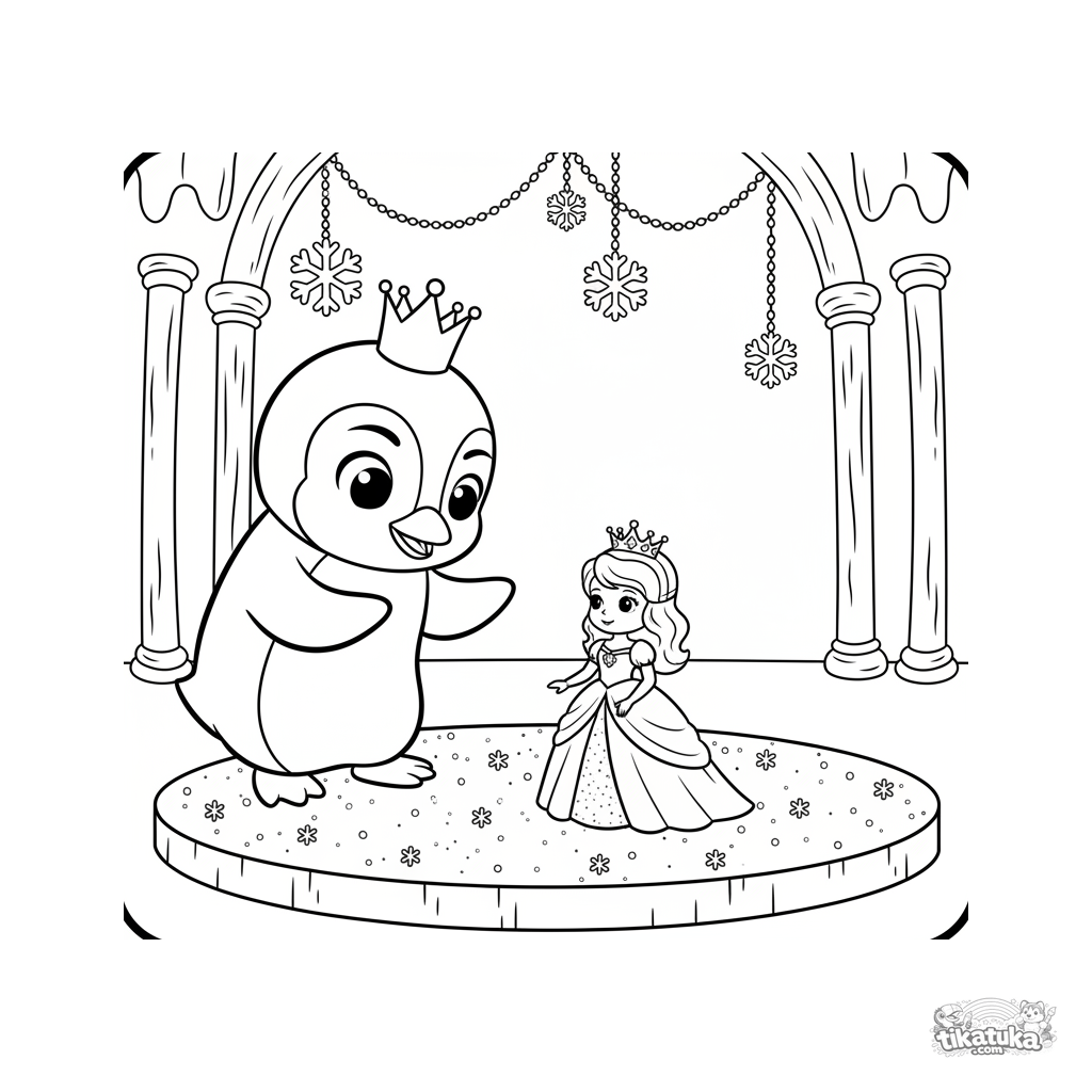 Coloring page for girls 4-6: penguin Marcel asking an ice princess to dance in a crystal palace. Soft puppet style.