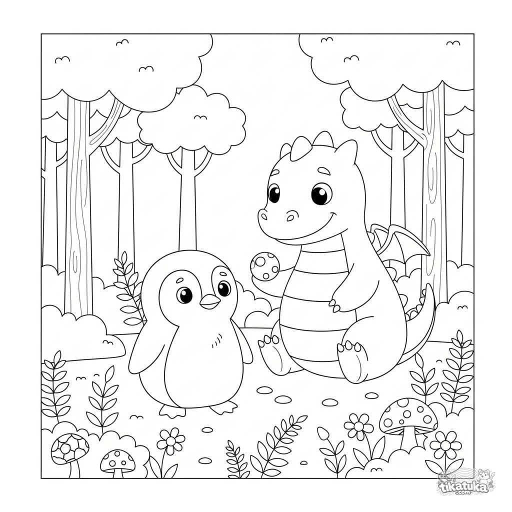 Coloring page for kids 4-6: penguin Marcel meets a friendly plush dragon in a forest clearing. Cute encounter, simple natural details.