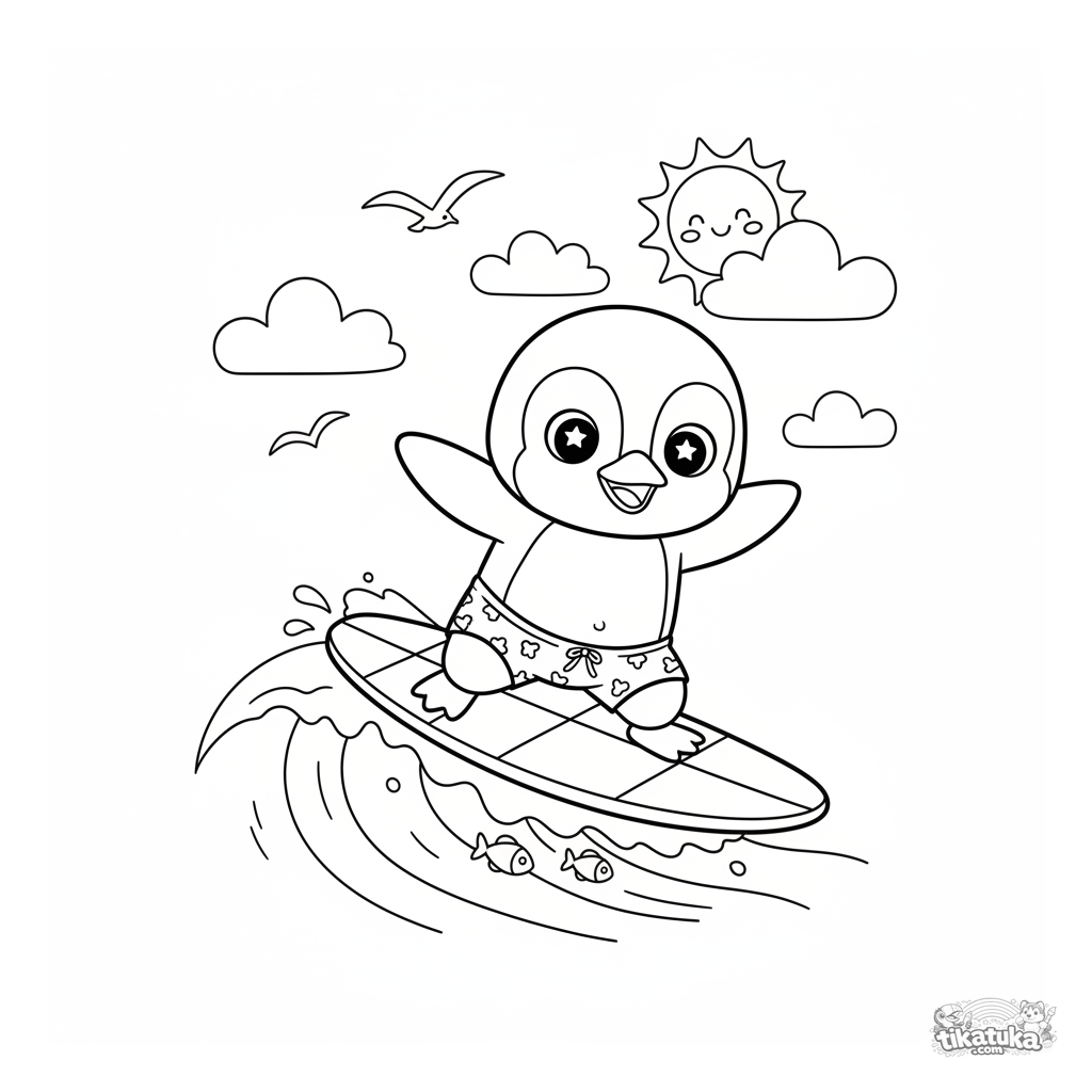 Coloring page for kids 4-6: penguin Marcel skillfully rides a surfboard on an ocean wave. Dynamic pose, simple background, develops coordination.