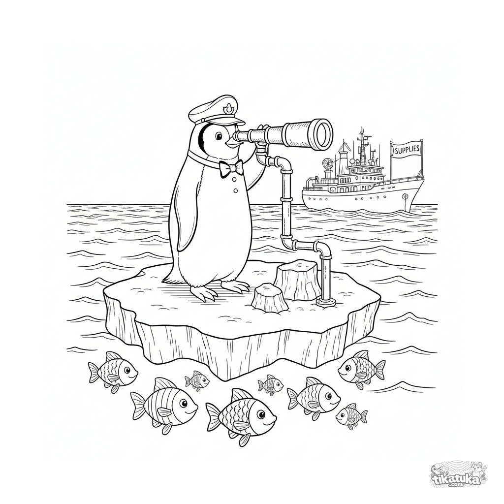 Coloring page for kids 10-12: a penguin in a captain's hat on an iceberg with a homemade periscope looks for a supply ship. Detailed funny scene in vintage engraving style.