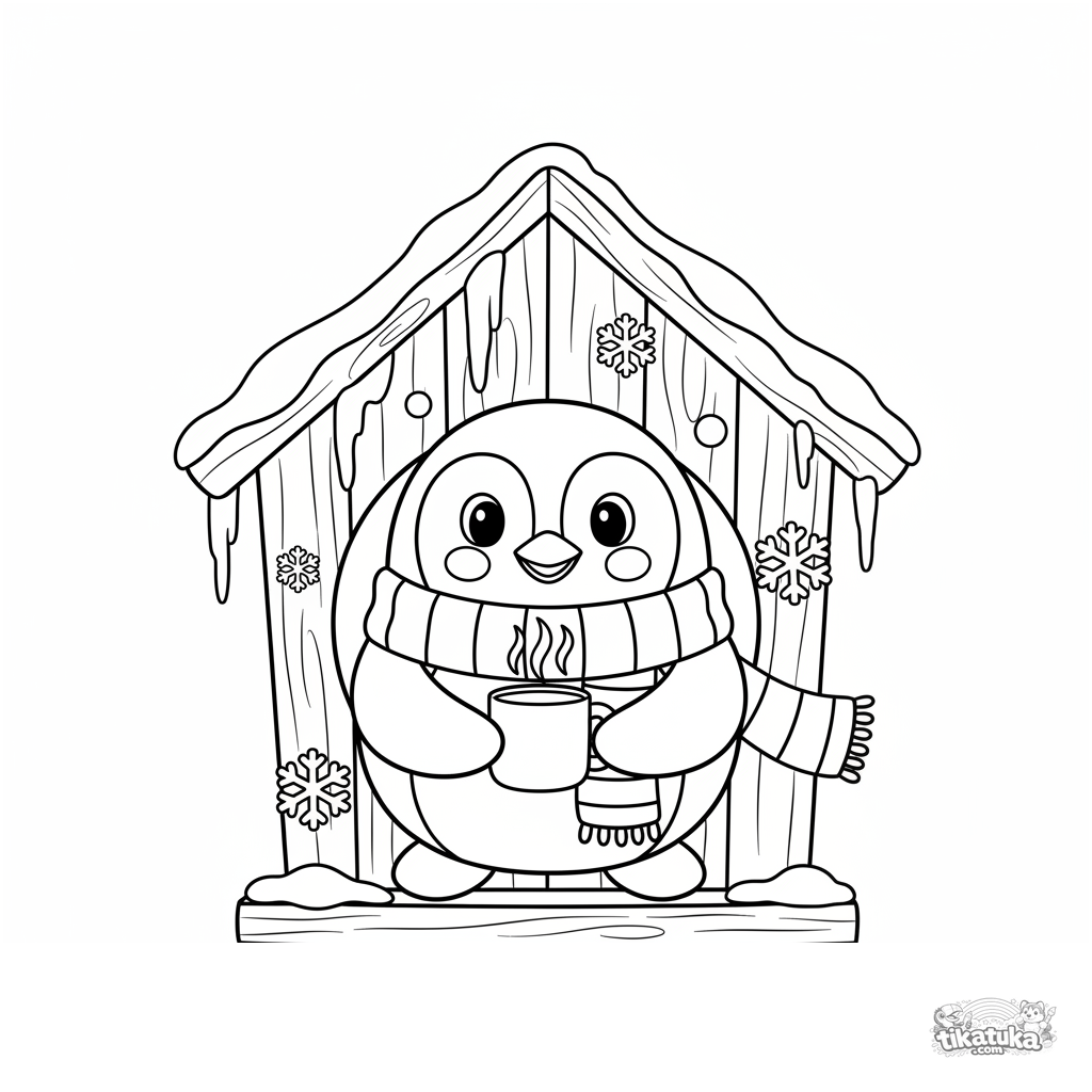 Simple coloring page for toddlers 2-3: a plush penguin in a scarf peeks from a snowy wooden birdhouse, holding a mug. Very simple, large shapes with wide, clean margins.