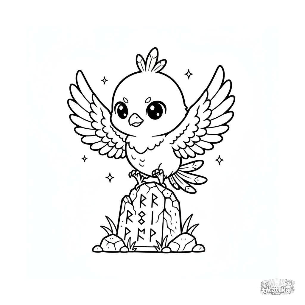 Coloring page of a fluffy phoenix chick learning to fly near an ancient rune pillar. For kids 4-6 years old. Cute and magical creature.