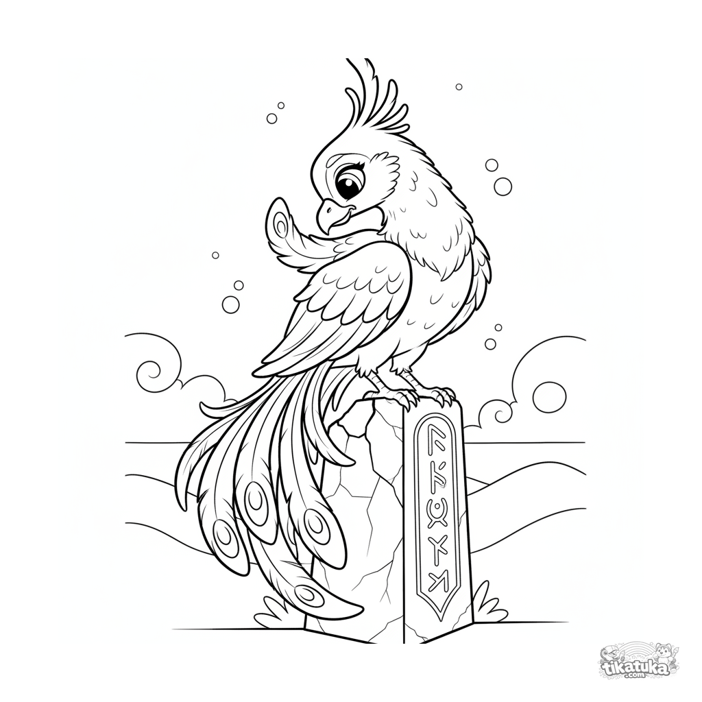 Coloring page for tweens 7-9: a majestic phoenix bird tends to its feathers while perched on an ancient runic stone. Elegant lines, decorative elements.