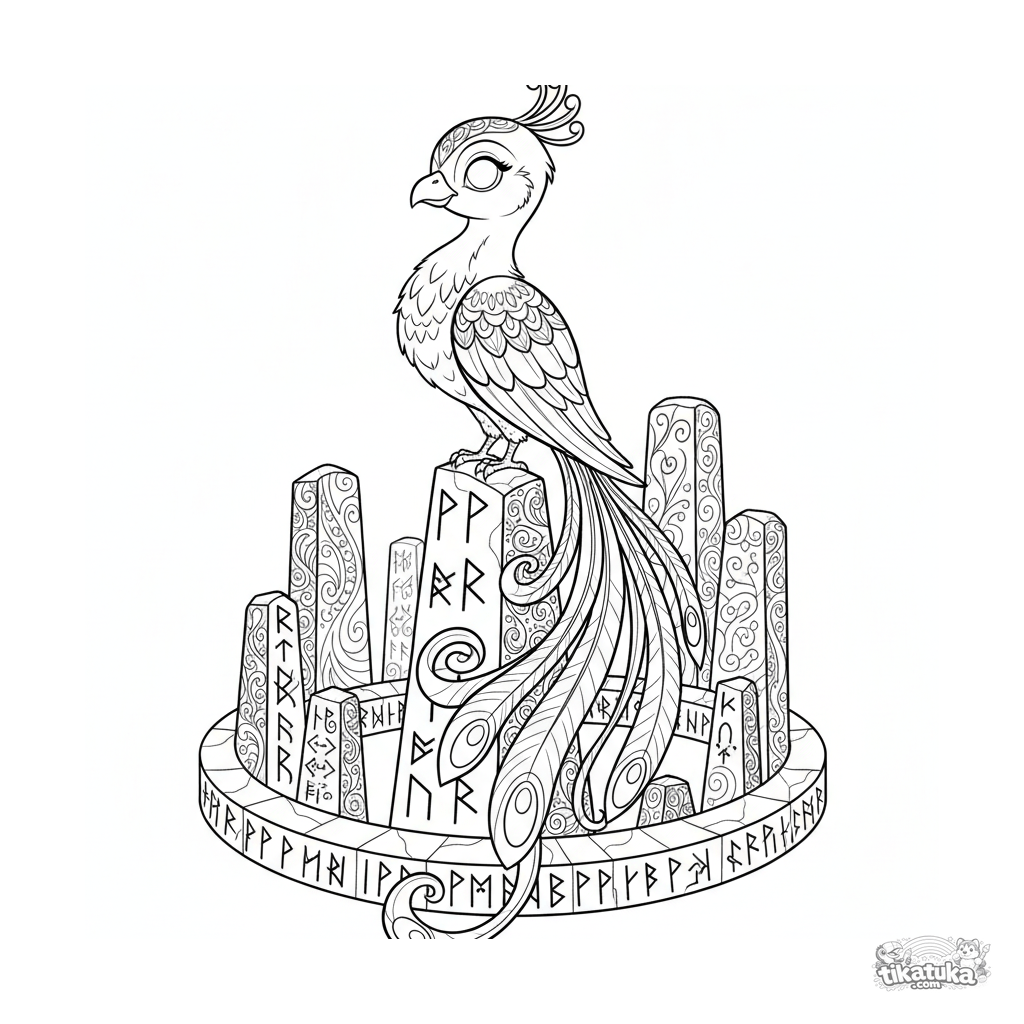 Complex coloring page for older kids 10-12: a majestic Phoenix greets the sunrise while perched atop an ancient runic monolith. Detailed linework and decorative elements.