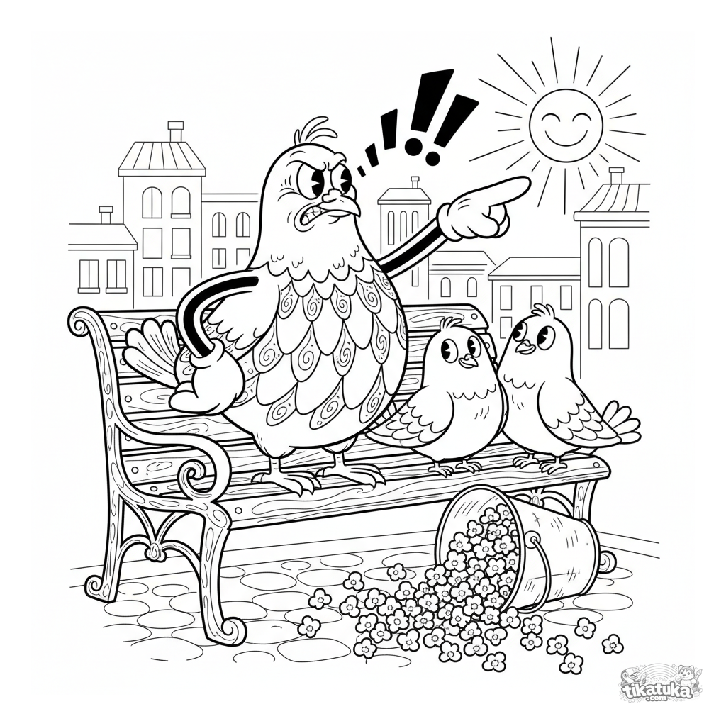 Coloring page for kids 7-12: a dramatic pigeon points at spilled popcorn on a city bench. A funny scene in internet-meme style.
