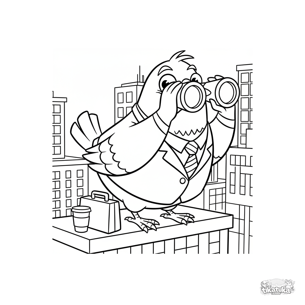 Coloring page for kids 10-12: a funny pigeon in a suit with binoculars scans for its paycheck from a skyscraper ledge. Humorous internet-style scene with details.