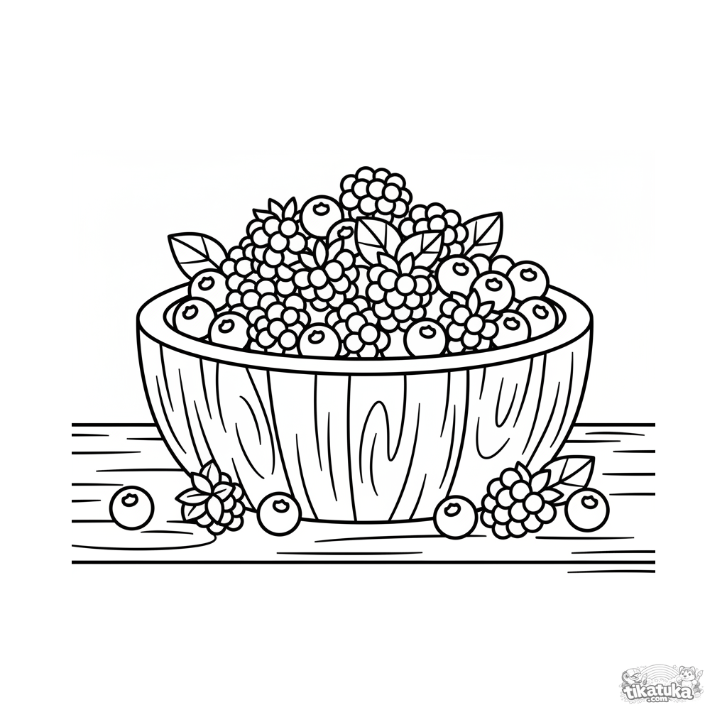 Coloring page of a wooden bowl full of mixed berries. For kids 4-6 years old. On a kitchen counter are raspberries, blackberries, blueberries, and scattered leaves.
