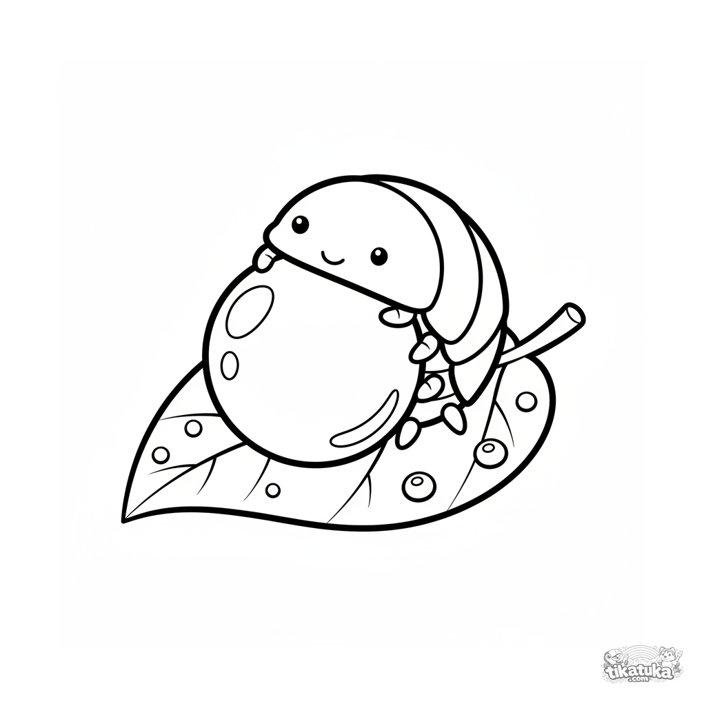 Simple coloring page for toddlers 2-3: a pill bug plays with a dewdrop like a ball on a large leaf. Very simple shapes, large character.