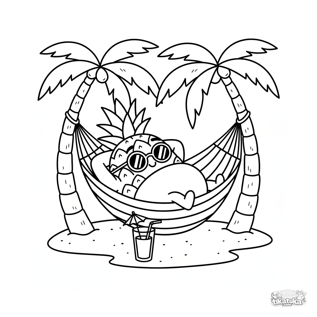 Coloring page for kids 4-6: a cool pineapple wearing sunglasses chills in a striped hammock. Fun, relaxed scene in a 90s Nickelodeon style.