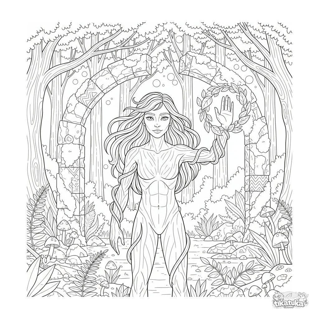 Coloring page for older kids 10-12: a plant-powered superhero stands guard over ancient ruins in a magical forest. A detailed scene with natural elements.