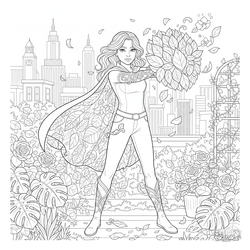 Coloring page for older kids 10-12: a plant-powered superhero creates a leafy shield in a rooftop garden above the city.