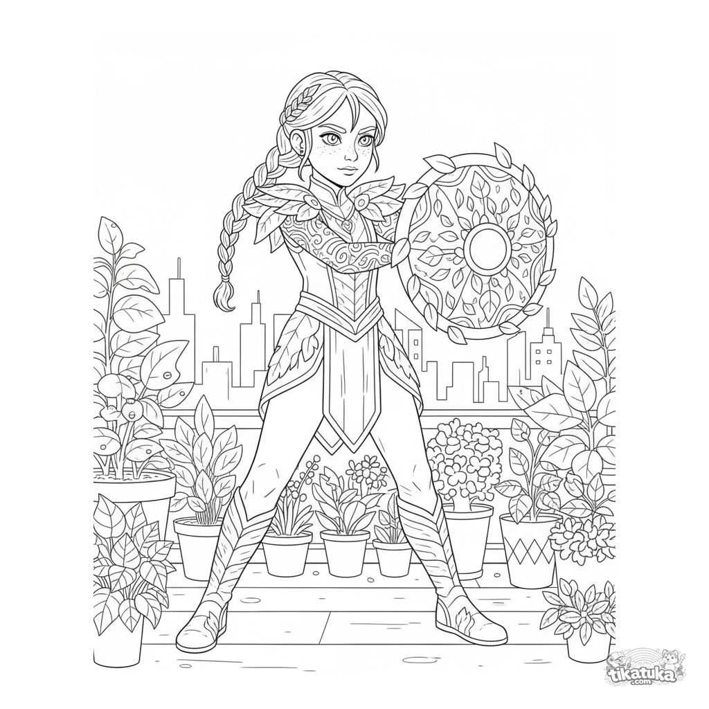Coloring page for older kids 10-12: a superhero with plant powers practices creating a vine shield on a city rooftop garden.