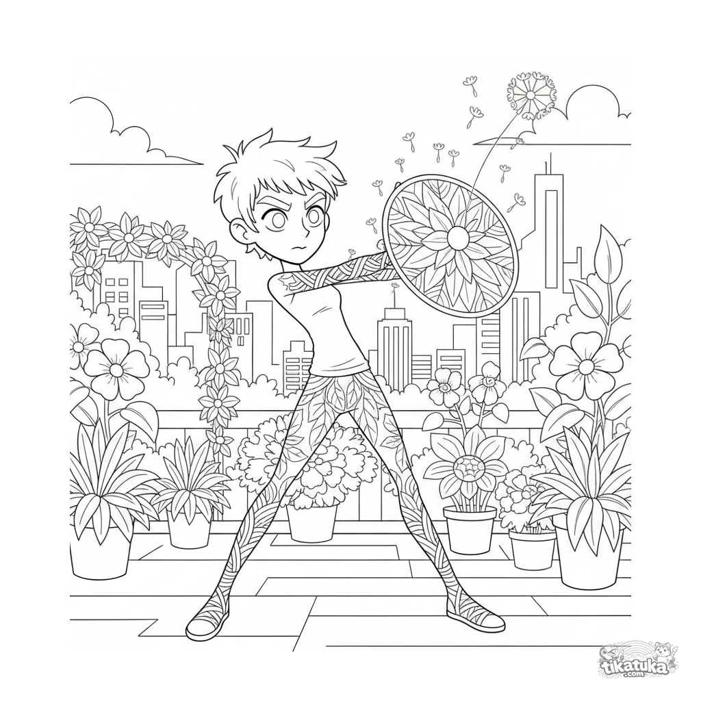 Coloring page for older kids 10-12: a teen plant hero creates a leafy shield in a rooftop garden above the city.