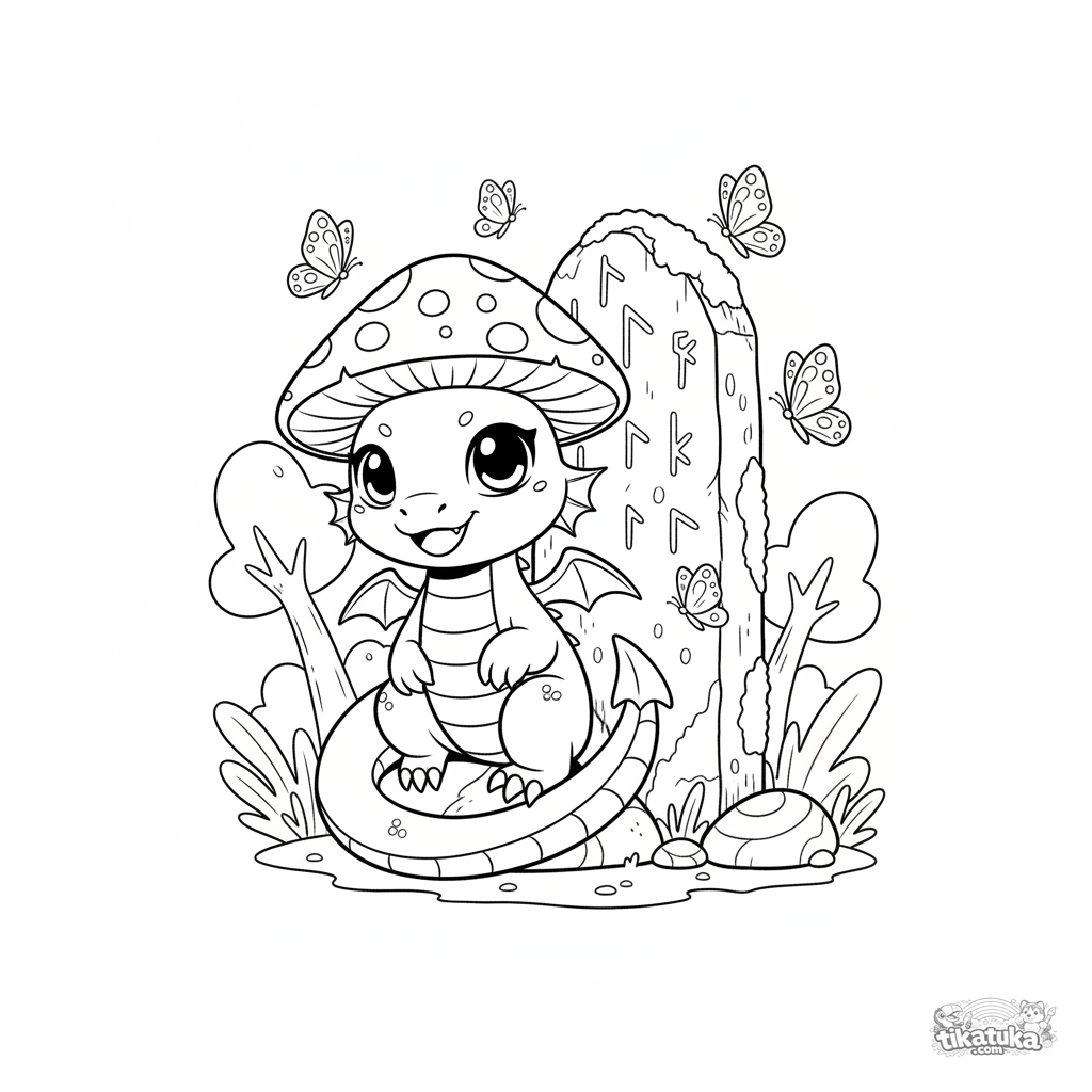 Coloring page for kids 4-6: a tiny dragon with dragonfly wings plays hide-and-seek behind an ancient runestone. Fun and simple scene.