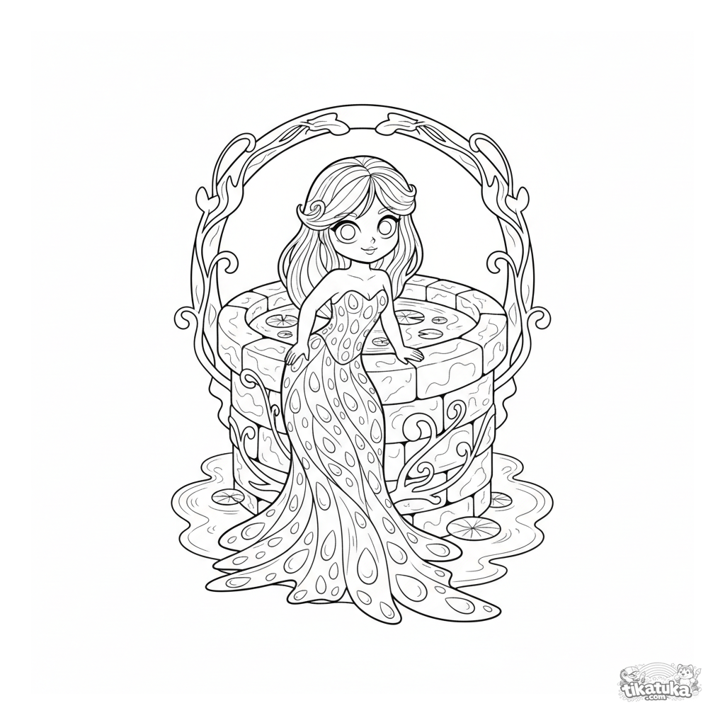 Coloring page for tweens 7-9: a playful water spirit peeks from the living water well. Scene in art nouveau lite style with flowing lines and magical mood.