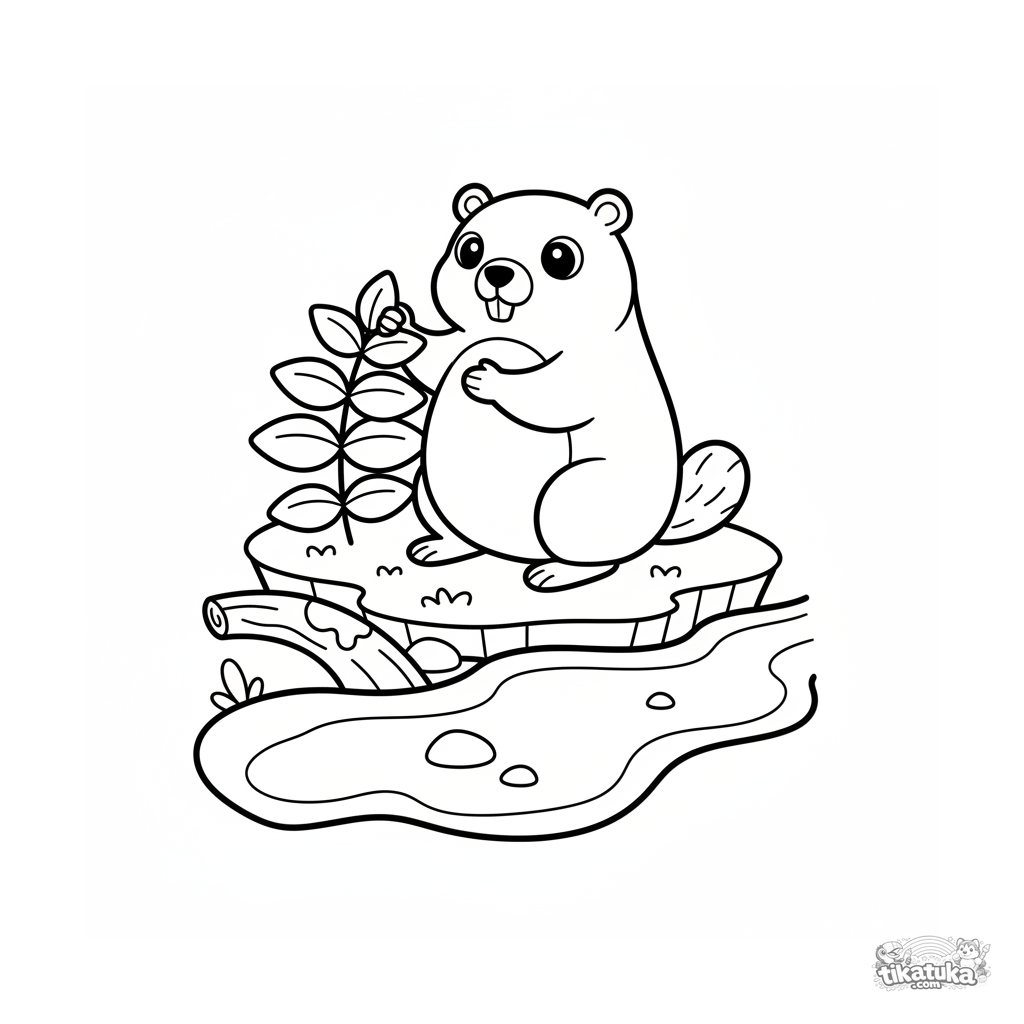 Toddler coloring page: a plump groundhog with a curious nose stands on the bank of a clear stream, sniffing wild mint. Simple shapes, wide margins.