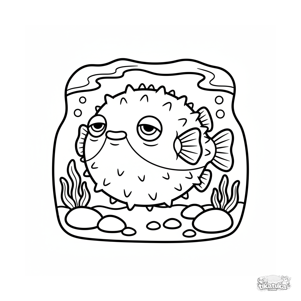 Simple coloring page for toddlers 2-3: A round pufferfish rests in a sunny tidepool in shallow water. Large shapes and minimal details.