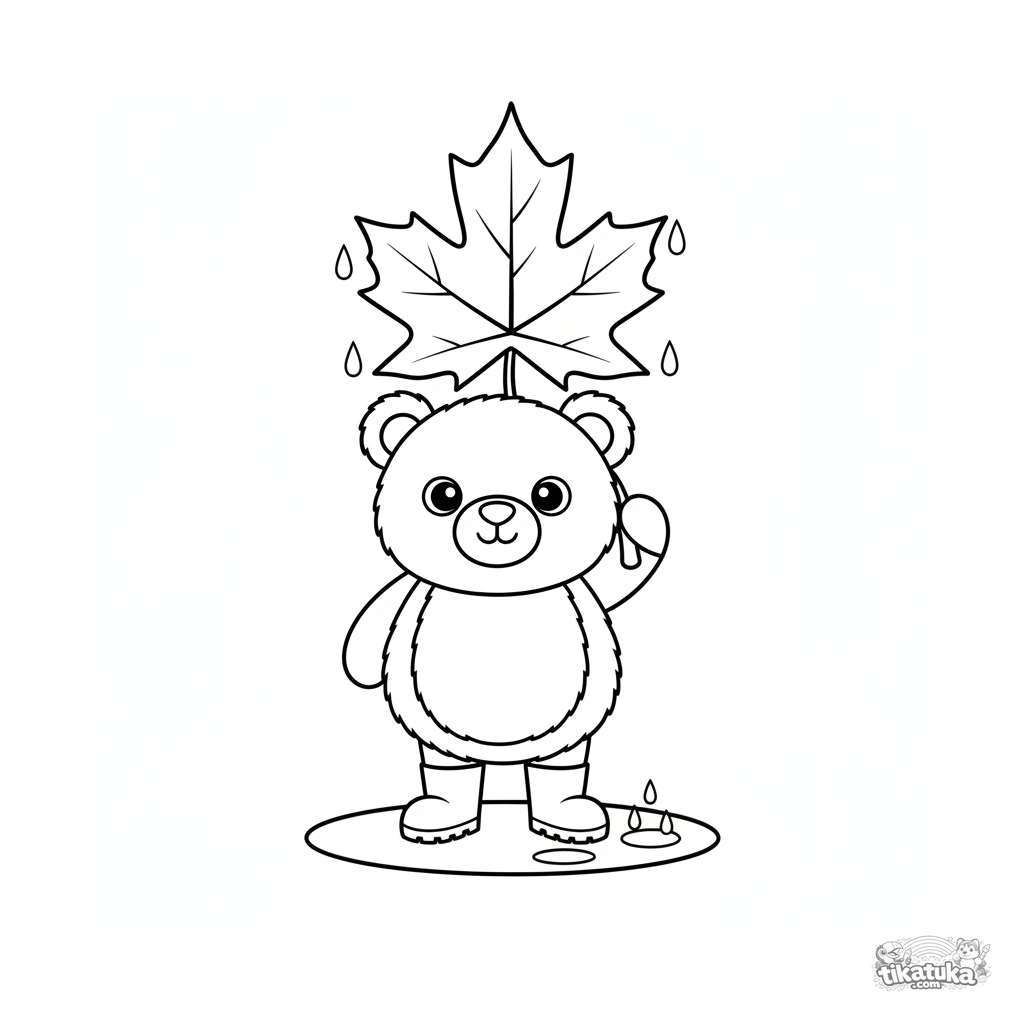 Toddler coloring page 2-3: a plush teddy bear in boots stands under a big maple leaf as an umbrella during autumn rain.