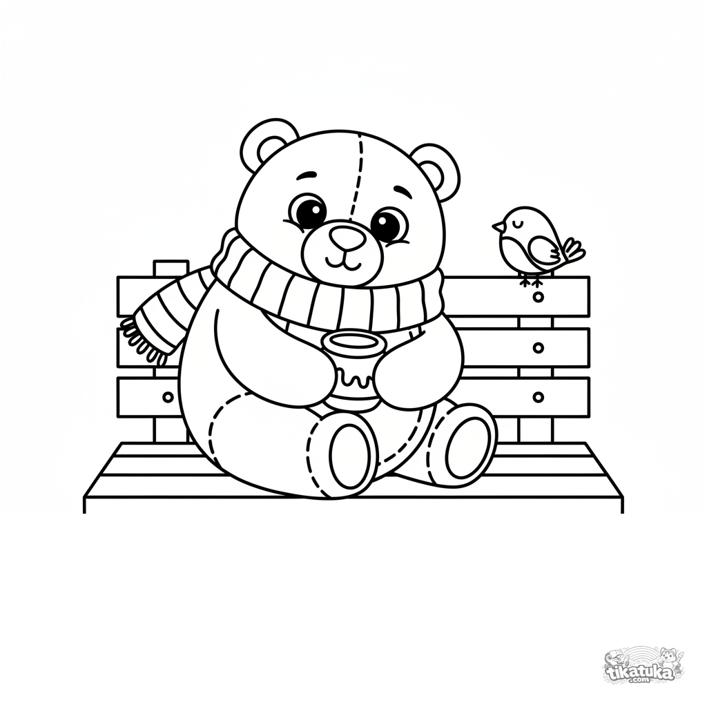 Simple coloring page for toddlers 2-3: a plush teddy bear napping on a park bench. Large clear shapes, few details, wide margins for coloring.